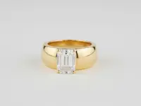 A chunky band and an east/west emerald-cut diamond create a modern, trendy look that’s perfect on its own and easily paired with other rings to create a chic stack.