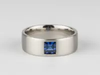 A handsome matte-brushed band is adorned with a princess-cut sapphire in this unique, eye-catching gemstone ring.