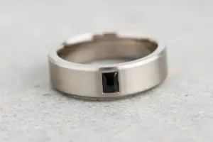 This modern mens wedding band features a vertical baguette-shaped black diamond set against a matte brushed finish for a defining look. The softened inside edge provides increased comfort for daily wear. This style can also be set with a blue sapphire or classic diamond baguette.